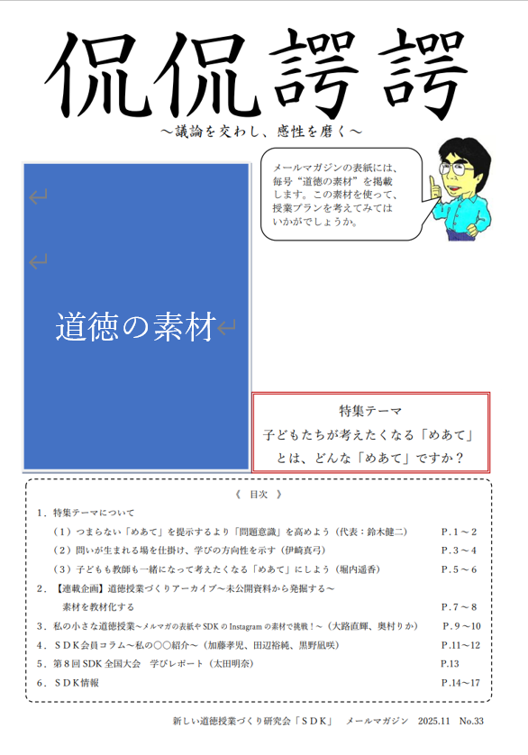 その上、子どもの育ちにも大きな効果が期待できます。SDKでは、素材発見や教材化の方法、実際の授業における効果等について検討し、誰でも取り組める小さな道徳授業づくりを提案していきます。
