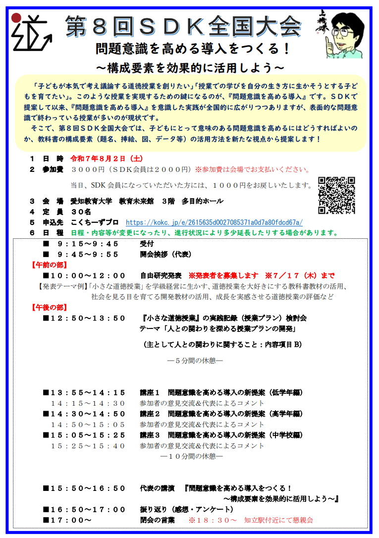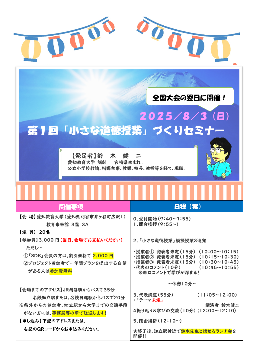 | 2025年8月3日(土) | 9:55~12:10 | 第1回 小さな道徳授業づくりセミナー |